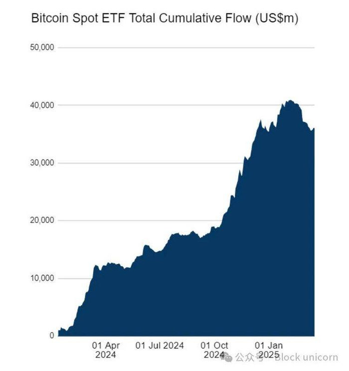 截至 2025 年初,几乎所有 ETF 流动性都流向了比特币,总额达 400 亿美元,如图表所示。难怪以太坊多年来对比特币一直在下跌。大多数山寨币也是如此。