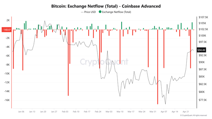 来自CryptoQuant的最新数据显示,2024年4月24日,超过8,756个比特币(约合8.3亿美元)从Coinbase平台提取。Coinbase的负净流出可能表明机构正在买入,或者ETF相关的购买反映了背后的需求。