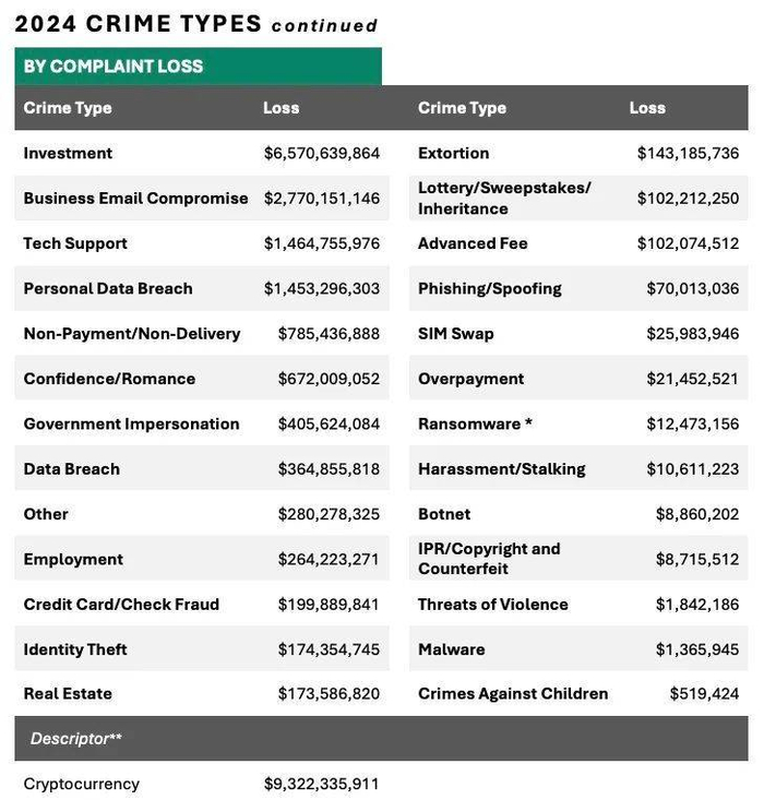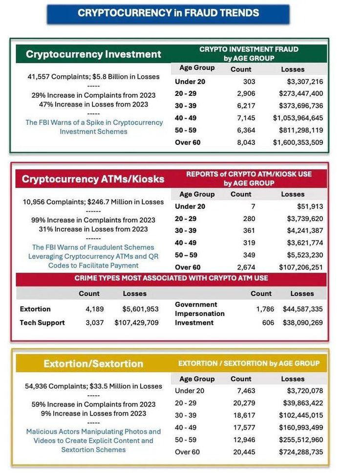 加密货币相关投诉达 149,686 起,造成 93 亿美元损失,损失金额同比增长 66%。受害者中,60 岁以上群体占比最高。