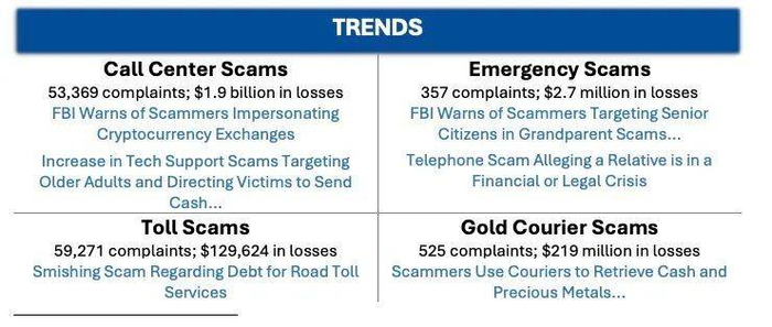 - 紧急诈骗(冒充亲属求助):357 起,损失 270 万美元。