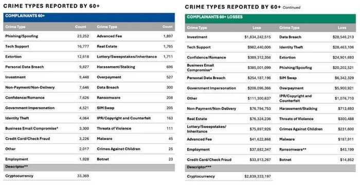这一群体提交了 147,127 起投诉,报告损失 48.85 亿美元。投诉量同比增长 46%,损失额同比增长 43%。其中 7,500 人报告损失超过 10 万美元,平均损失高达 8.3 万美元。