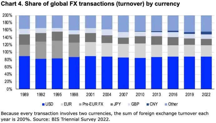 正因如此,我们将比特币视为一种超国家的储值资产,并认为其在构建国际贸易中的货币信用方面具有独特优势。目前,全球超过 80% 的国际贸易仍以美元结算(见图 4),但随着全球逐步迈向多极化体系,越来越多国家对在国际收支中持续依赖美元作为中介感到不安。然而,现实中可供选择的替代方案仍然非常有限。