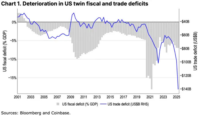 本文整理自 Coinbase 最新发布的月度展望研究报告。报告指出,随着美国‘双赤字’持续扩大、贸易保护主义加剧,市场对美元的信心不断削弱,全球或将迎来一轮大规模的资产组合重构。在这一背景下,比特币因具备主权中立、不受资本管制等特性,正被越来越多国家视为潜在的超国家储备资产。根据报告保守估算,若全球储备体系逐步纳入比特币,其总市值有望新增约 1.2 万亿美元。