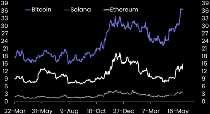 据 Matrixport 发布最新报告(分析师为 10x Research 的 Markus Thielen)显示,自 4 月低点以来,期货未平仓合约大幅攀升。尽管 Solana 因 meme 币和 Pump.fun 热潮降温而退居次席,比特币的未平仓合约却出现显著增长。这一激增可能反映出市场风险偏好的转变,尤其是在特朗普近期关税政策逆转之后。比特币继续扮演着‘风险偏好’与‘避险’双重角色,并日益契合‘数字黄金’的叙事。