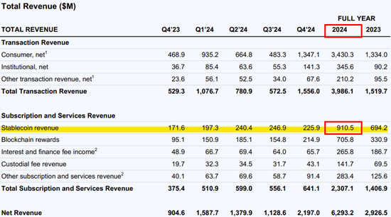 根据Coinbase披露的数据,2024年,Coinbase从USDC相关业务中获利9.08亿美元,约占其净收入的14.5%。
