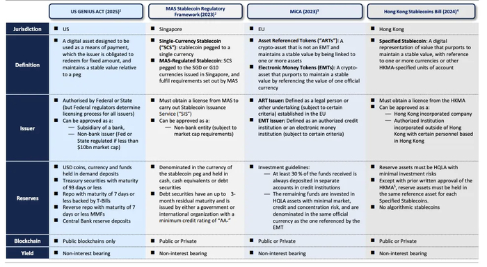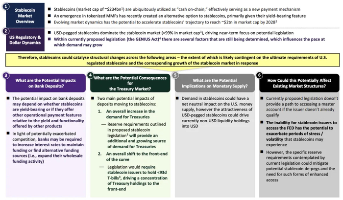 新的稳定币监管体系在强化中心化管控的同时,也为市场注入了监管的确定性。当前,法案第 4(6) 条未明确允许稳定币发行方向持币者支付利息,尽管市场可能催生替代方案,但此问题仍存不确定性。同时,《Genius Act》要求稳定币储备必须为 1:1 的美元或美国国债等高流动性安全资产。