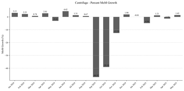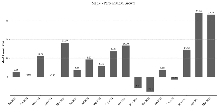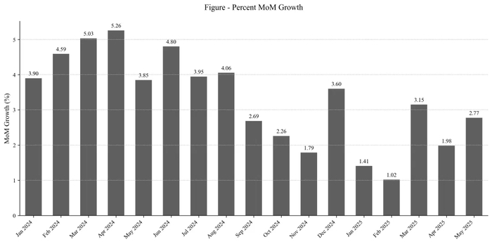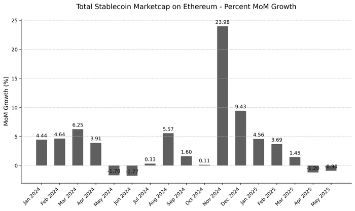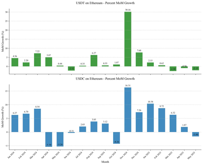 2025 年 1 月增速再度爆发,环比飙升 33.2%。经历 2 月短暂回调后,以太坊连续四个月维持两位数增长,其中 4 月与 5 月环比增幅均突破 20% 大关。