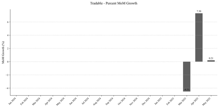 随着 BUIDL 迅速崛起为以太坊 RWA 生态中市值最大的项目,其增长路径的精细研判至关重要。环比增速图表揭示:截至 2025 年 3 月,该指标保持相对平稳,随后于 2025 年 3 月呈现爆发式跃升。然而最新的 5 月数据显示,超高速增长态势稍稍放缓,但仍有 2.1 亿美元的增涨,月环比增幅 8.38%。未来数月的发展是关键观测窗口——需追踪其增速是否延续趋缓态势,亦或继续爆发式的增涨。
