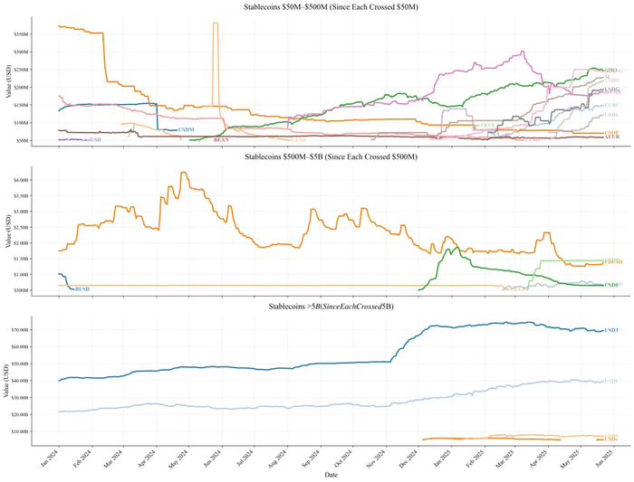 中型项目(5-50 亿美元)在 2024 年仅有 FDUSD 和FRAX;BUSD 因终止发行,从 2024 年 1 月的 10 亿美元骤降至 3 月不足 5 亿美元。但在 2025 年,USD0 与 PYUSD 双双突破 5 亿美元门槛,中型稳定币更加多元。