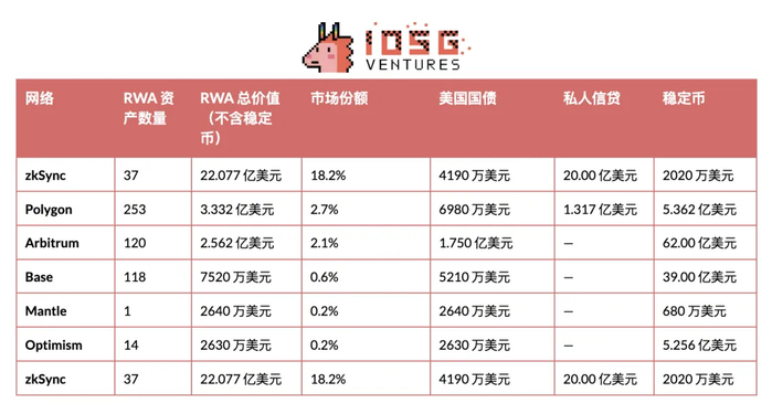 将视野扩展至整个 L2 生态体系,各网络 RWA 价值与市场份额呈现显著分化(见下表)。除 zkSync 外,仅 Polygon 与 Arbitrum 形成实质规模效应,其余 L2 仍处早期发展阶段。Polygon 与 Arbitrum 的成功高度依赖单一驱动力 Spiko——该项目在两条网络中均贡献约三分之一的 RWA 总价值。