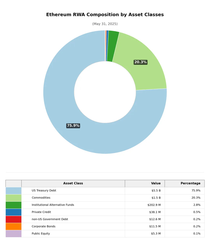 按资产类别划分(稳定币除外),以太坊上的真实世界资产(RWA)市值高度集中于两个主要品类:国债类项目(75.9%)和大宗商品类(以黄金为主,20.3%),其他类别占小。相比之下,在整个加密市场的RWA市值构成中,私募信贷占比最高(57.4%),国债类项目次之(30.9%)。
