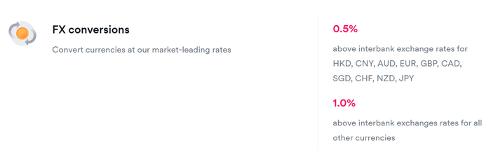 外汇兑换费用方面,Airwallex 提供极具竞争力的汇率,仅在市场中间价基础上加收约 0.2%–0.5% 的转换费(具体加成视币种和地区而定,一般主流币种 0.5%。这一费率远低于传统银行常见的 1%-3% 的汇差。