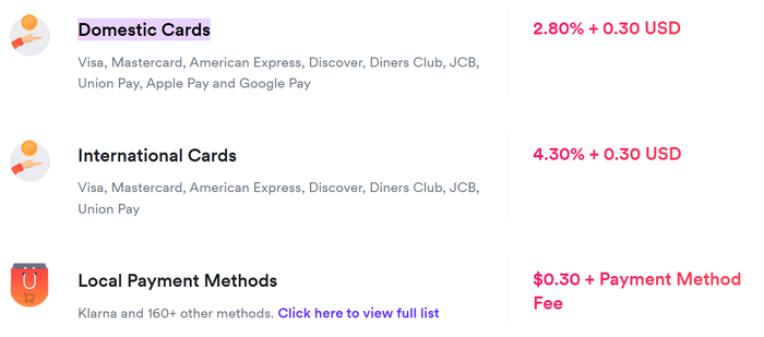支付收单费用方面,Airwallex 为商户提供的线上收款按交易额百分比收费:本地发行的银行卡付款费率约 2.8% + 固定 $0.30 美元 / 笔,国际卡付款费率约 4.3% + $0.30;本地电子钱包或转账等替代支付方式一般每笔 $0.30 外加各支付方式的成本费率。