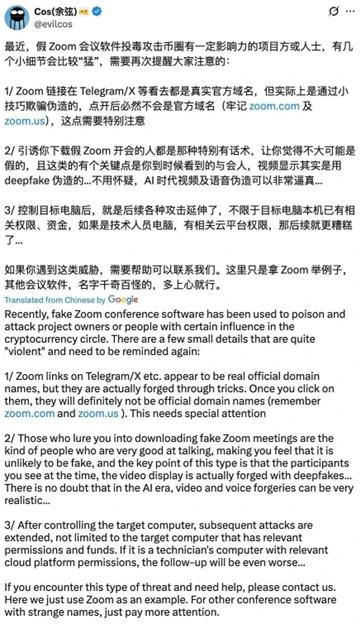 诈骗者冒充 Zoom 发送伪造会议邀请链接,诱骗用户下载含木马的“会议软件”。会议中“参会者”使用深度伪造视频冒充高管或技术专家,操控受害者进一步点击,进行授权或转账。设备被控制后,诈骗者就会开始远程控制设备,窃取云数据或私钥。