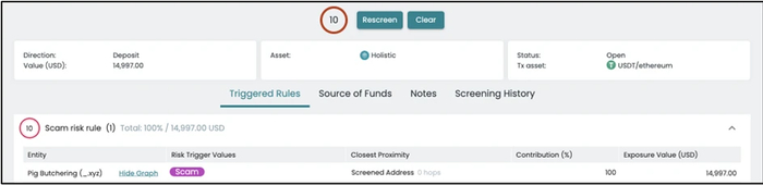 工具给出 10/10 最高风险评分,触发人工审核流程——用户资金不会自动入账,该活动将移交合规团队手动核查。