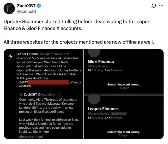 此外,链上庞氏项目的典型模式也在不断演变。2024 年区块链分析师 ZachXBT 曝光诈骗团伙在 Blast 链部署 Leaper Finance 项目。该团伙曾运作 Magnate、Kokomo、Solfire 以及 Lendora 等项目窃取数千万美元,他们伪造身份认证文件与审计报告,预洗资金并人为刷高链上数据引诱用户投资,TVL 达数百万美元后迅速抽逃流动性,卷钱跑路。