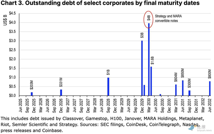 尽管如此,我们认为这类风险在短期内尚不足以对市场构成巨大冲击。首先,大多数债务将在 2029-2030 年才到期(如 Strategy 的 30 亿美元可转债首个可赎回期为 2026 年底,正式到期为 2029 年底),因此短期抛售风险较低。其次,目前的贷款价值比(LTV)整体尚属健康,部分大型公司有能力通过再融资回避强制出售。