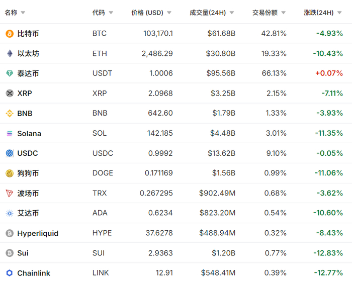 截至券商中国记者发稿,比特币下跌4.93%报10.3万美元,以太坊跌10.43%报2486美元。另外,BNB跌近4%,XRP跌超7%,Solana、狗狗币、艾达币跌幅均超过10%。