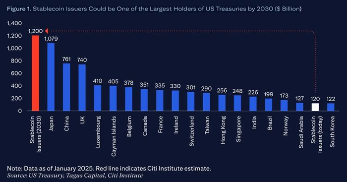 稳定币发行方已成为短期美债的重要买家,合计持有 1500–2000 亿美元,已可与中等规模主权国家持有量相比;