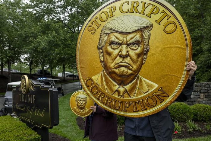 5 月 22 日,在弗吉尼亚州斯特林举行的特朗普国家高尔夫球场外,来自‘Our Revolution’组织的活动人士在特朗普国家高尔夫球场外举行了示威活动。当天在此举办特朗普的私人晚宴邀请了 220 位 TRUMP 代币的最大持有者。图片来源:美联社