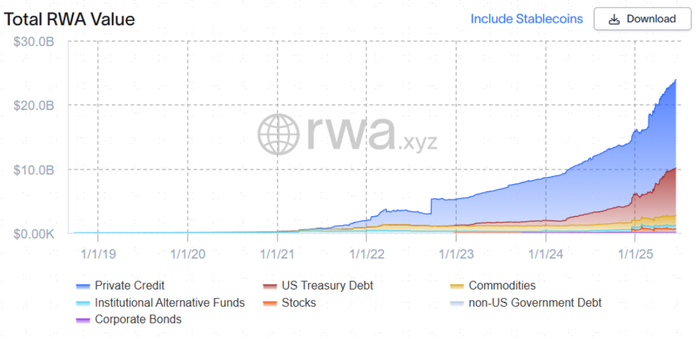 从资产类别来看,私人信贷和美国国债构成了RWA市场的双核心。根据 RWA.xyz 数据,截至2025年6月30日,RWA资产类别中,私人信贷和美国国债市值分别有143亿美元和74亿美元,合计占比接近90%。商品位列第三,市值16亿美元,主要是由 Paxos 和 Tether 等机构发行的代币化黄金 。此外也有将货币市场基金份额、房产、数字艺术品(没有实物资产)等切割代币化,如贝莱德基金BUIDL项目、房地产分割平台(如RealT)。