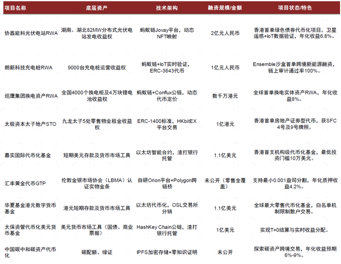 首单绿色债券代币化:协鑫能科光伏电站RWA。2024年12月,协鑫能科和蚂蚁数科合作将湖北、湖南82MW户用光伏(“鑫阳光”品牌)电站发电收益权代币化。通过区块链+IoT(物联网)技术将光伏项目价值、运营、收益数据打包上链。首单换电实体资产RWA:巡鹰出行的换电资产RWA。2025年3月,迅鹰集团和蚂蚁数科将换电柜和锂电池运营收益权代币化,通过蚂蚁链+Conflux公链实时上链IoT数据。