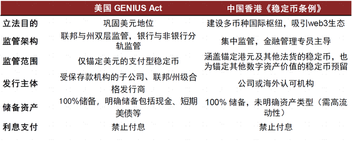 为何在目前阶段要对稳定币规范化?近年来稳定币发展迅猛,渗透到众多领域,引起广泛关注。而发展过程中也出现过一些风险和信任危机事件,引起了各地区监管机构的关注和重视。虽然此前各国/地区对于加密货币有谨慎和担忧,但面对问题和解决问题可能会迎来更多的发展机遇,加以规范可以在法币结算系统上提升效率和推动金融有更多的创新发展,也可能催生出各类主体都有可参与的新业务机会。2025年全球关键市场中国香港《稳定币条例》与美国GENIUS Act的监管框架落地/取得实质性进展,为稳定币的发展奠定了合规性基础。中国香港采取“多币种 + 价值锚定”监管模式,要求持牌发行、100%储备资产及严格KYC、反洗钱标准,旨在巩固国际金融中心地位。美国GENIUS Act则强化联邦与州双层监管,限定稳定币为无息支付工具,储备资产仅限美元、短期美债等高流动性资产,以巩固美元地位。两地立法为稳定币提供合规通行证,推动其从技术实验转向规模化应用。