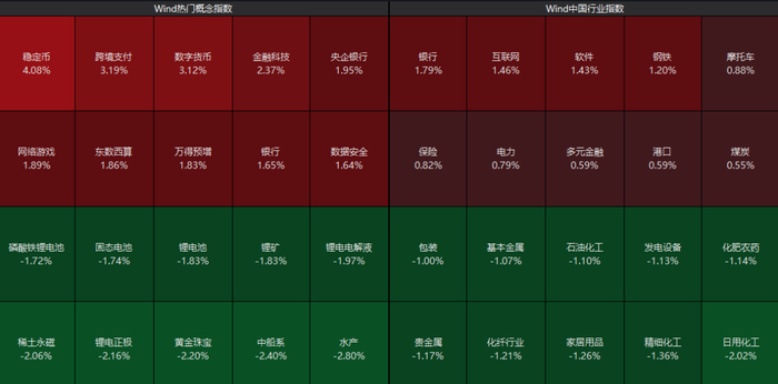 从板块来看,稳定币概念股异动拉升,电力、银行、软件等板块涨幅居前,而化工、贵金属、锂电等板块震荡调整。