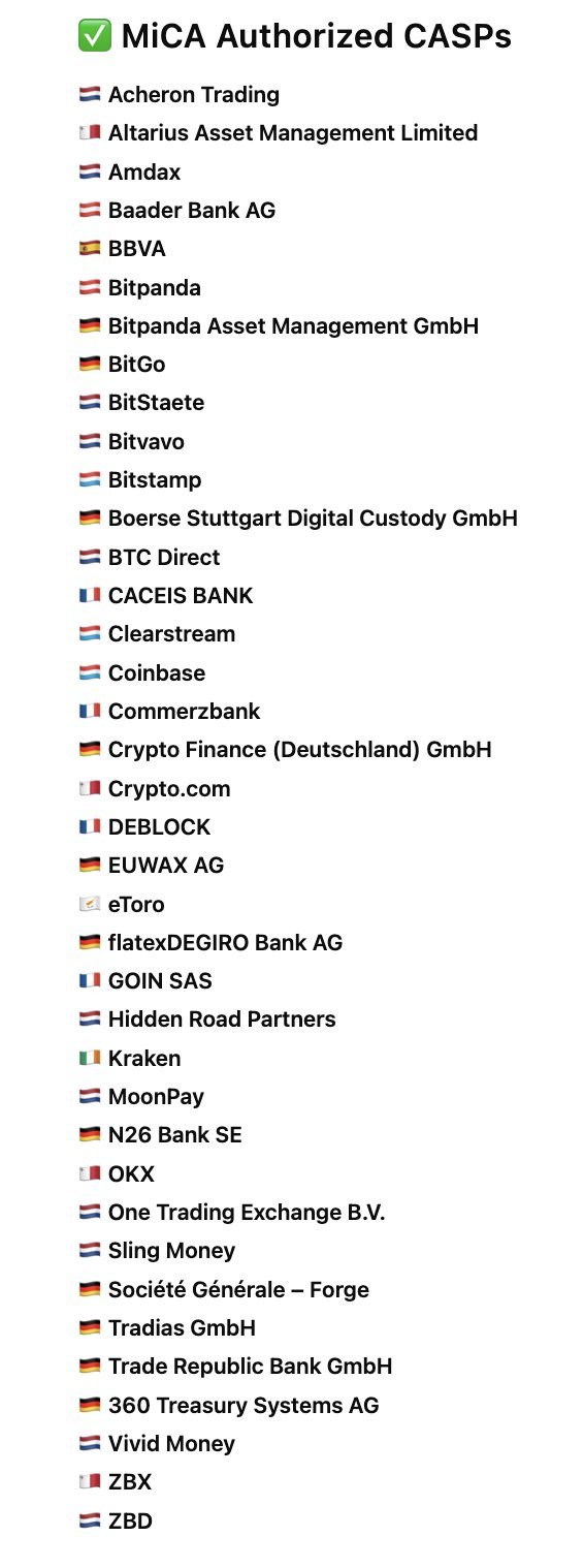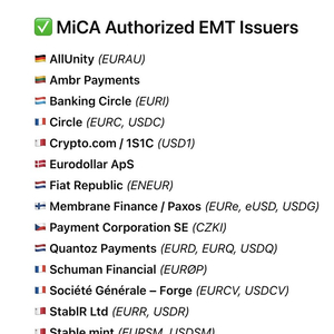 Circle 高管 Patrick Hansen 分享的最新数据显示,已有 53 家机构获欧盟 MiCA 牌照,可在欧洲经济区 30 国 “护照通行” 提供服务,无需逐国申请。其中 14 家企业获准发行稳定币或电子货币代币(EMT),包括 Circle、Crypto com、法国兴业银行、Stablemint、Quantoz 和 StablR 等;USDT 发行方 Tether 尚未合规,未列入名单。另有 39 家加密资产服务商(CASPs)获批,如 BBVA、Robinhood、Coinbase、Kraken、OKX 等。币安未上榜。