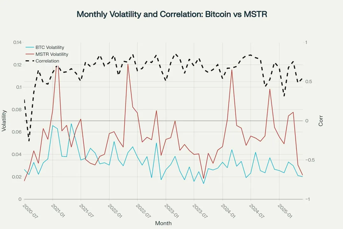 按月份对比特币与 MSTR 的波动率与相关性进行统计,可以看出,大部分时间 MSTR 与比特币的价格相关性在 0.6 - 0.8 的区间,呈现强相关;同时,大部分时间 MSTR 的波动率数倍高于比特币,从结果上看,MSTR 称得上比特币的现货杠杆证券。从另一方面也可以验证 MSTR 的比特币杠杆属性:2025 年 6 月 MSTR 1 个月期看涨期权隐含波动率 110%,较比特币现货高 40 个百分点,显示市场赋予其杠杆溢价。