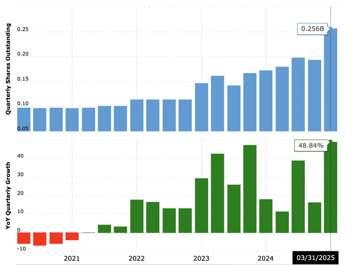 因为其独特的融资结构,当比特币上涨时,MSTR 以更高的幅度上涨,大量债务将被转换为股票。事实上,自从微策略宣布购买比特币以来,微策略的总股本已经从 100M 上升至 256M,涨幅 156%。