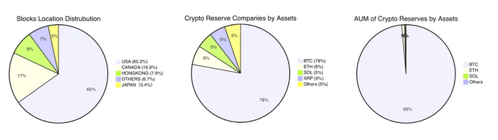 从上市公司储备的加密资产种类来看,BTC 占 78%,ETH、SOL、XRP 等比例接近,都在 5% - 6% 的水平,而储备其他加密资产的公司占剩余的 5%。