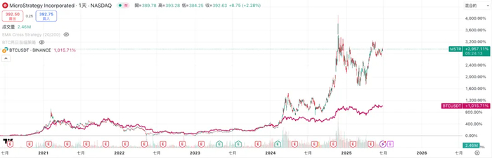 自 2020 年微策略宣布实行比特币战略储备以来,股价便与比特币的价格呈现高度相关性,而且波动率远高于比特币本身,由下图可以得出直观感受。从 2020 年 8 月至今,MSTR 累计涨幅接近 30 倍,同时期比特币价格涨幅仅为 10 倍。