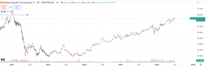 · 比特币主导地位在 2024 年持续上升,达到 65% 左右的高位。