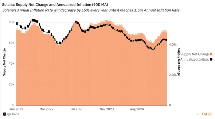 1. 比特币作为 POW 型代币,没有生息机制,但总量固定,通胀率持续下降(当前为 1.8%),资产具备稀缺性。PoS 型代币可以通过质押获得回报,当质押回报率高于代币通胀率,质押资产获得名义增值。当前 SOL 质押年化回报 7% - 13%,通胀率 5%;ETH 质押年化回报 3% - 5%,通胀率不到 1%。当前的 ETH/SOL 质押能够产生额外收益,但需要注意通胀率与质押回报的变化情况。
