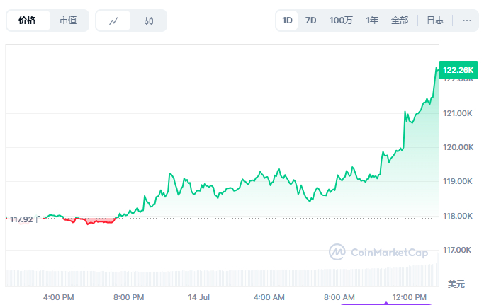 行情数据显示,比特币价格在周一亚洲时段最新交投于122323.18美元,日内上涨约3.72%。其中,比特币价格在北京时间11点35左右出现了一波快速的拉升行情,短短十分钟内就飙升了逾1000美元,强势攻克12万美元整数关口,此后升势持续一发不可收。