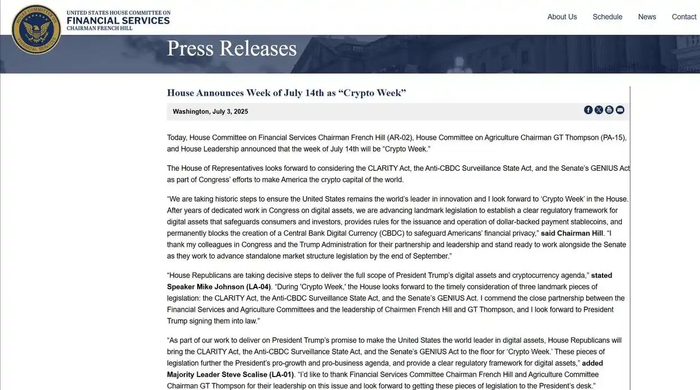 早在当地时间7月3日,美国众议院就曾宣布将7月14日当周定为“加密货币周”,届时将审议《数字资产市场透明法案》(Clarity Act)、《反CBDC监控州法案》(Anti-CBDC Surveillance StateAct)以及《指导与建立美国稳定币国家创新法案》(GENIUS Act)等多项法案,为数字资产行业提供其长期以来要求的国家监管框架。
