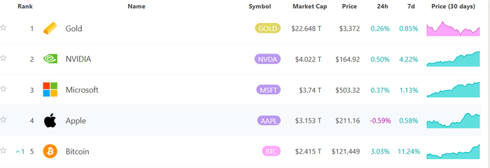 根据CoinMarketCap的数据,加密货币行业的总市值目前已膨胀至约3.78万亿美元。其中,比特币的实时市值目前已经达到了2.415万亿美元,这足以使其超越亚马逊,跻身全球跨资产市值榜的前五位——仅次于黄金和美股前三大巨头(英伟达、微软和苹果)。