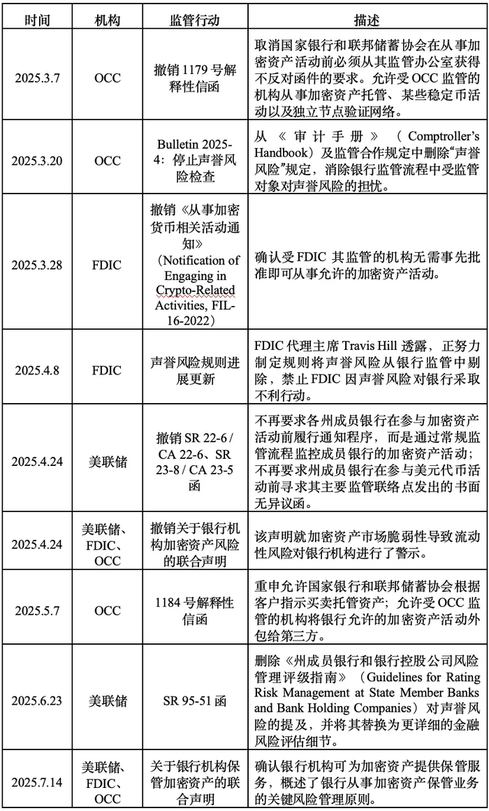 自特朗普二次上台以来,美国政府对加密资产的态度发生了显著的转变,本次联合声明正是在此背景下发布的。过去几个月,美国多个银行监管部门曾采取一系列行动,撤回了拜登时代涉及加密资产的各种解释性信函和监管声明。其中一项重大举措是从监管程序中删除了 “声誉风险” 评估,用更具体的金融风险类别取代模糊的声誉风险,此举有效避免了审查机构向银行施压致其不愿为加密资产公司提供服务的现象,有助于消除了银行对加密资产等争议行业提供服务的现实顾虑。