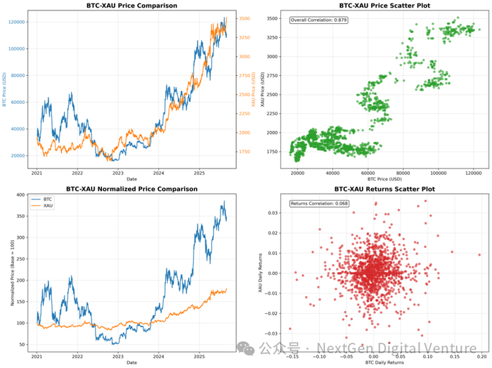 NDV 研究团队近期对比特币(BTC)与黄金(XAU)的价格关系做了一次系统性分析。之所以关注这一主题,是因为这两类资产常常被市场视作“价值储藏”和“对冲工具”:黄金作为传统的避险资产,数十年来一直是全球投资者的“安全港”;而 BTC 则被越来越多的投资者称为“数字黄金”,并在宏观不确定性上升的背景下获得了新的地位。