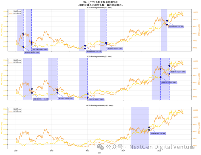 黄金强、BTC 弱:2021 年春夏:黄金因通胀担忧走强,比特币因中国监管与马斯克言论大跌; 2021 年底至2022 年初:地缘冲突推升黄金,但BTC 因美联储紧缩与科技股回调走弱; 2025 年一季度,贸易摩擦和中东冲突 → 黄金突破 3000 美元,而 BTC 则进入“利好兑现”后的高位回调。