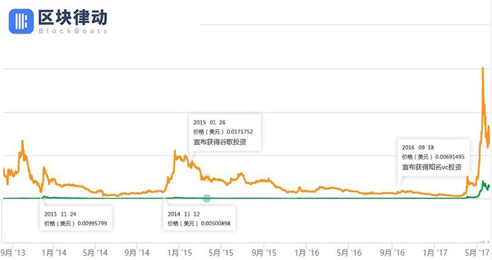从外部资料信息来看,两个项目之间并没有太多交集,但却因国内外一线资本的介入而一飞冲天,两个币的发展历史颇有‘历史总会重演’的感觉。