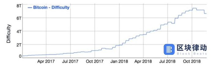 另外比特币挖矿的一个机制是挖矿难度(也即解决哈希函数的难度)会每 2 周调整一次,为的是在算力过高的时候出块速度不至于太快,在算力过低的时候出块速度也不至于太慢,能够一直稳定在 10 分钟左右出一个块。