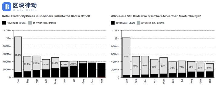 从数据上看,由于算力的增加和比特币价格的下降,矿工的利润今年一直就持续处在下滑状态,逐渐向零趋近。但是,在这其中,矿主也应该分成两部分来看。