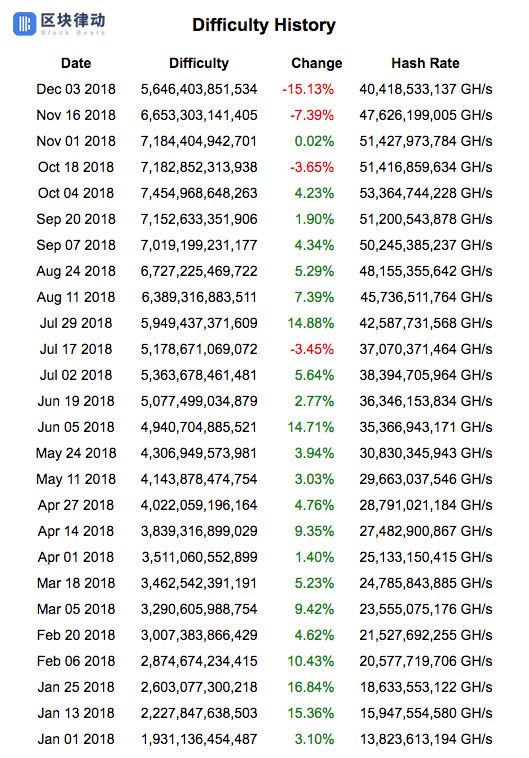 下图为bitcoinwisdom提供的数据,比特币的挖矿难度变化。可以看出与算力下降相对应的,从10月起挖矿难度便也开始下降了。在最近一次难度调整时,挖矿难度更是前所未有地降低了 15%。而在此之前,比特币算力只有 2 次降低,其他时间几乎都在增长,在不到一年的时间内涨了接近 3 倍。