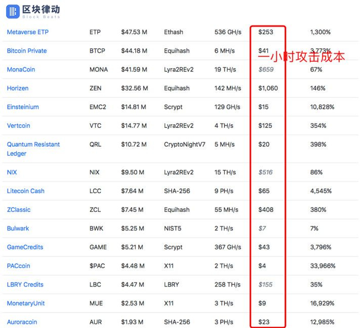 推特上有网友评论说:‘只需要一百多美元每小时来租用算力就够了,Vertcoin 被攻击是必然呀!’那么其他的网络上 51% 算力攻击的成本是多少呢?根据 Crypto51 的数据,一小时攻击成本比 Vertcoin 小的链多到令人发指。