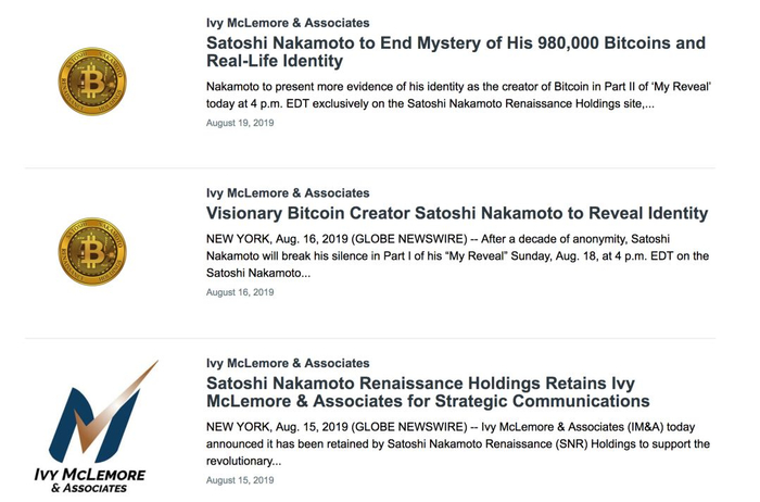 紧接着,8月16日GlobeNewswire又发布了新的报道,报道称,经过十年的匿名,Satoshi Nakamoto将于8月18日周日下午4点在Satoshi Nakamoto Renaissance Holdings的网站www.SatoshiNRH.com以及Ivy McLemore&Associates的网站www.ivymclemore.com揭示自己身份信息的第一部分。