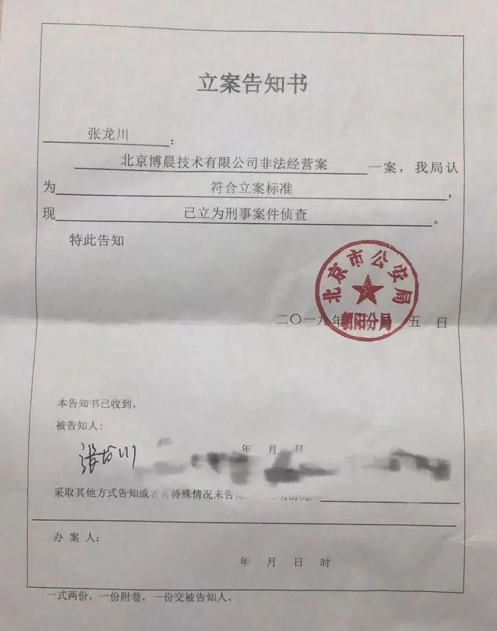 张龙川最早从2019年1月就开始维权,并曾一度绝望至企图自杀。同年3月,他拿到北京公安局发出的“北京博晨技术有限公司非法经营案”立案通知书。