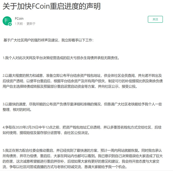 他更不相信重启会有用,因为张健已经信誉破产。张健唯有归还所有用户资产,才有重启FCoin的希望。
