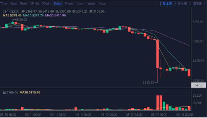 糟糕的24小时从3月12日12点开始。由于新冠疫情在欧美地区快速扩散,连日来全球金融市场都阴雨连连,比特币价格经过多次调整后此前3天都在7600-8200美元区间内上下徘徊,但在12日12点之后,比特币价格首度跌破7600美元,击破许多投资者的心理预期,进入快速下滑通道,并在18点左右跌至7200美元。
